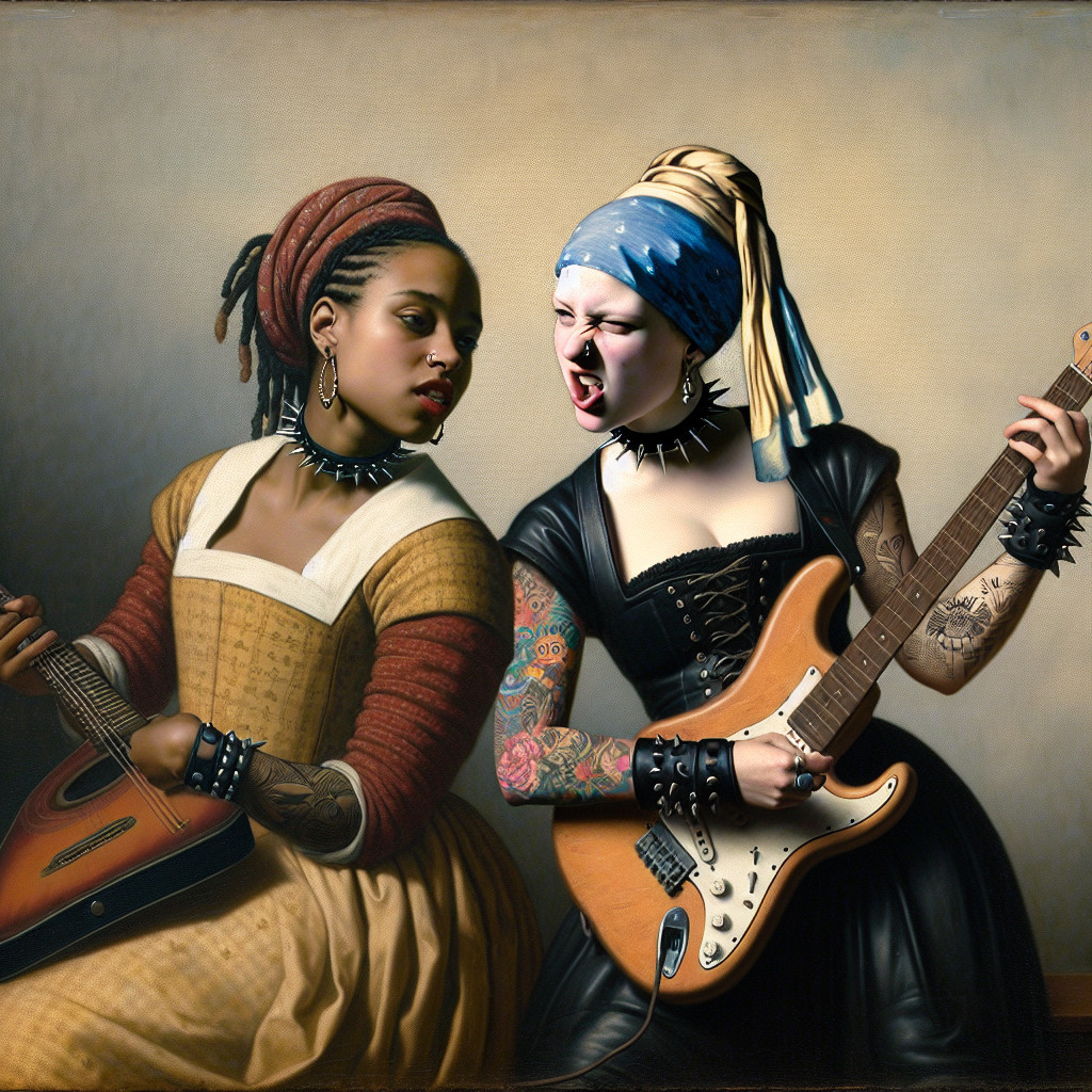 Two women in vibrant, contrasting dresses strike fierce poses. One holds a guitar, while both showcase intricate tattoos and bold accessories, blending historical fashion with modern style.
