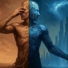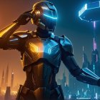 A futuristic figure in sleek armor poses with a finger to its temple, against a vibrant cityscape illuminated by neon lights and towering structures, evoking a sci-fi atmosphere.