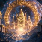 A golden circular structure with intricate designs is set against a cosmic background. Majestic architecture rises behind it, reflecting in a serene body of water under a starry sky.