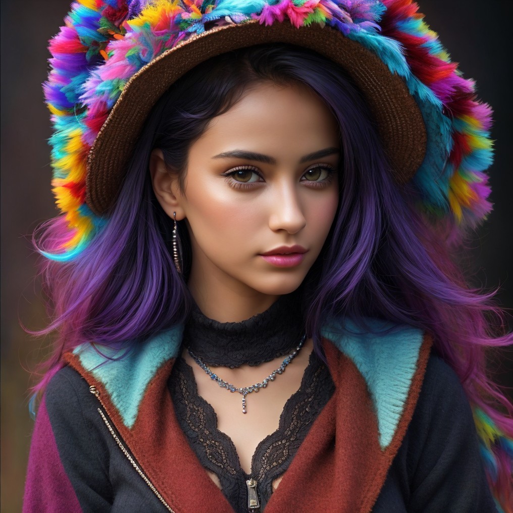 A young woman with long, flowing hair gazes thoughtfully at the viewer. She wears a vibrant, floral-patterned top, framed by a mesmerizing, colorful psychedelic background.