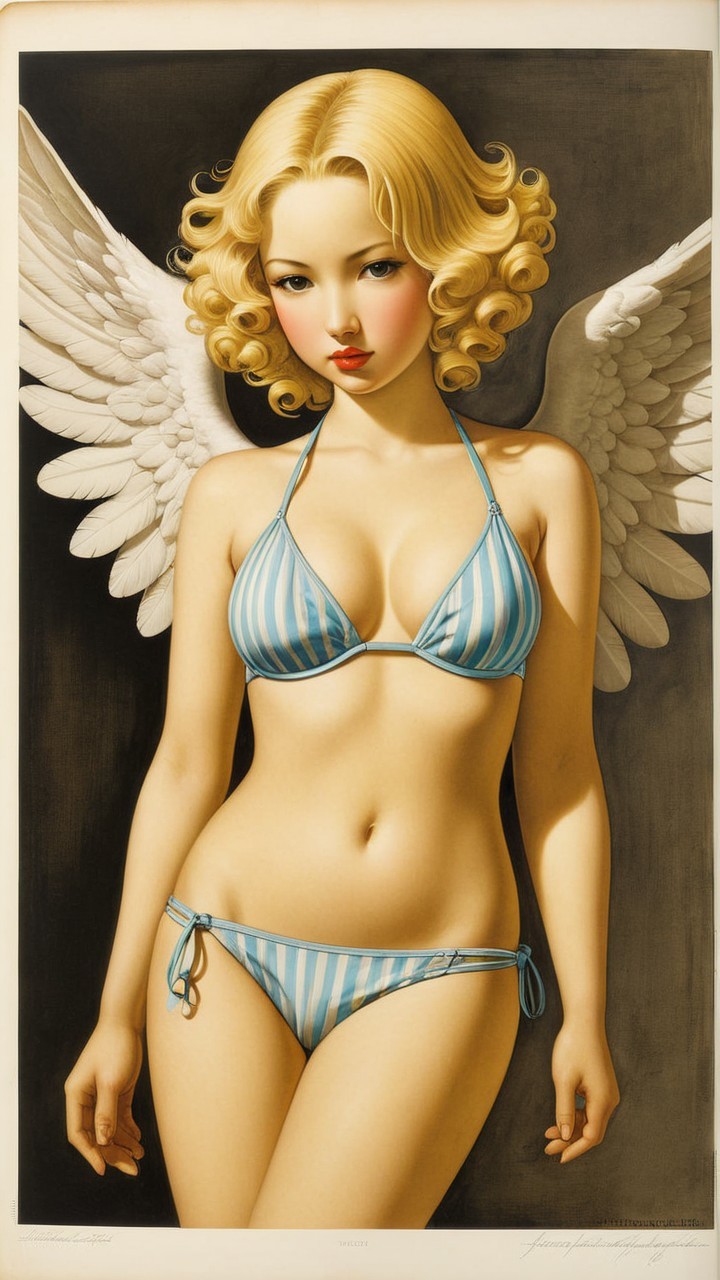 A young woman with blonde, curly hair poses in a blue-striped bikini, featuring delicate angel wings. The artwork showcases a blend of beauty and fantasy in a striking, ethereal style.