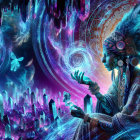 A cosmic shaman sits amid vibrant crystals, surrounded by swirling galaxies and ethereal butterflies. His ornate attire and feathered headdress reflect a deep connection to the universe.
