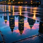 A city's skyline is mirrored in a puddle on a wet street, capturing vibrant reflections of shimmering lights and a colorful sunset, creating a serene urban atmosphere after the rain.
