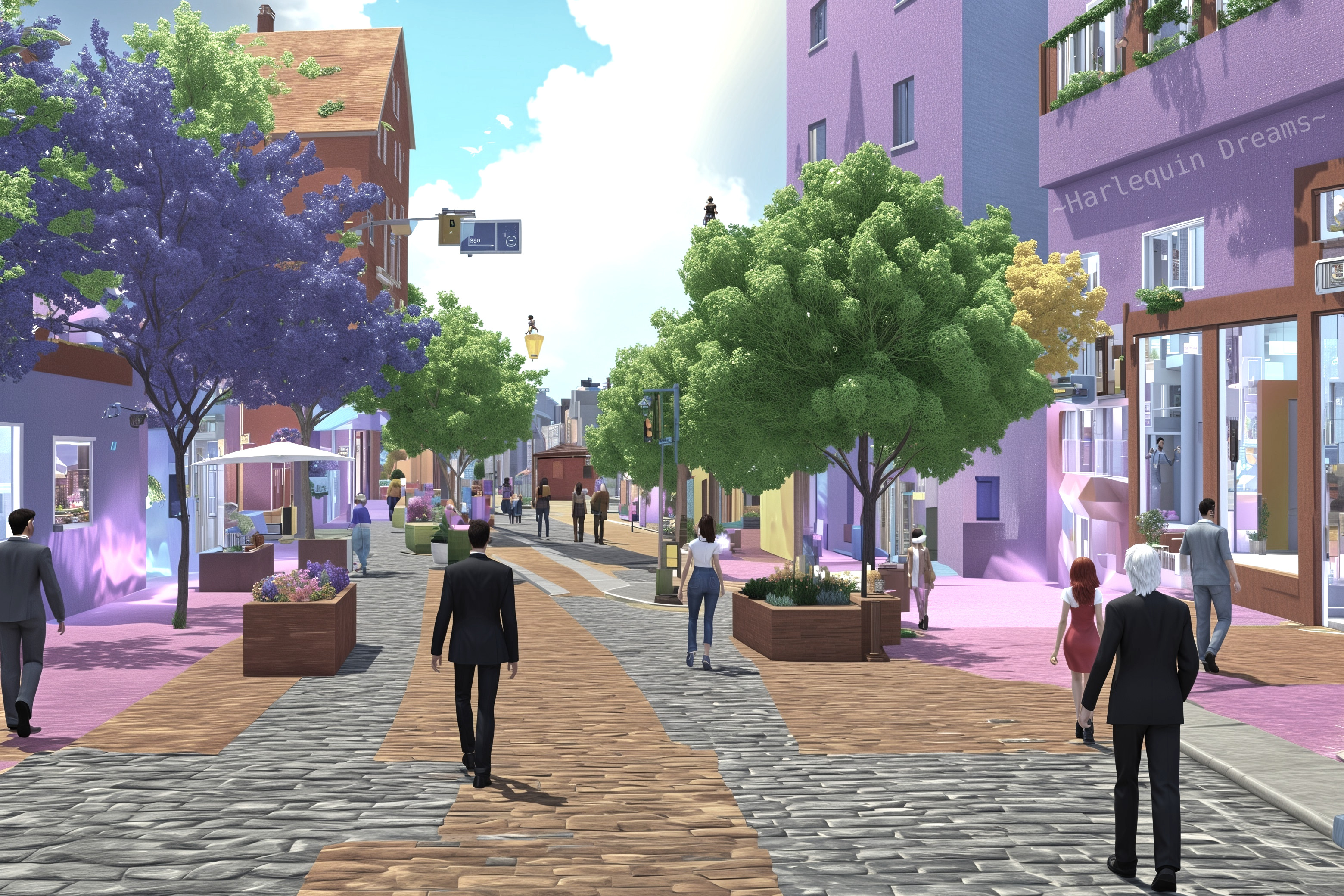 A vibrant street scene features colorful buildings, lush trees, and cobblestone paths. People stroll leisurely, enjoying shops and cafes in a cheerful, picturesque setting under a blue sky. Everything within a computer simulation, a virtual world.