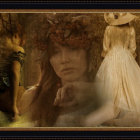 A dreamy painting portrays a little girl in a mustard yellow jacket walking on a wet beach at sunset with a fluffy scarf, her reflection visible in the wet sand. She walks away from the viewer, while two terrier dogs stand on the left, one looking right and the other looking left with a leash hanging