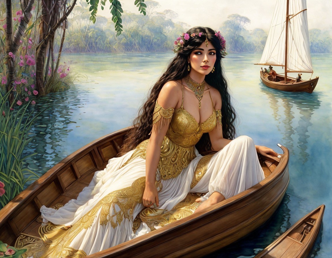 A woman in a flowing gown reclines in a wooden rowboat adorned with flowers, with serene waters and greenery around her.
