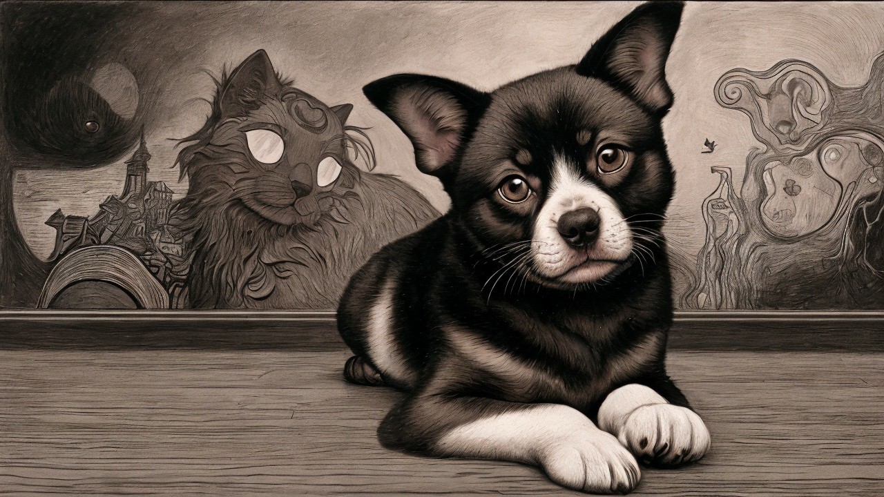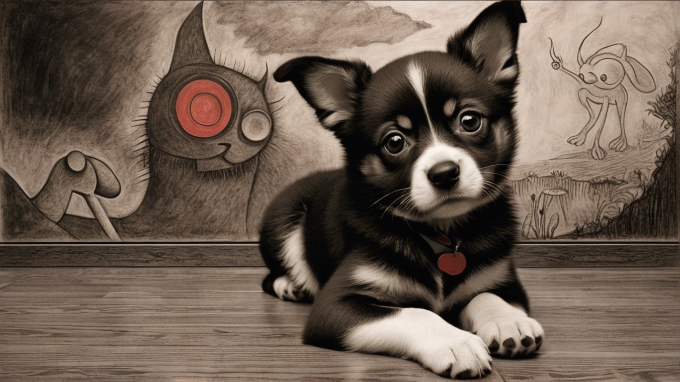 A cute puppy with distinct black and white fur lies on a wooden floor, gazing curiously at the camera, with an artistic abstract background featuring shapes and lines.
