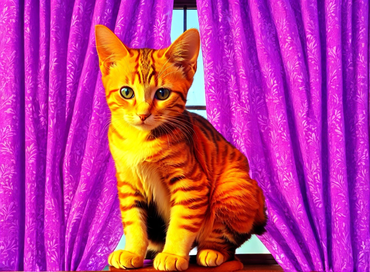 A vividly colored portrait of an orange-striped cat sitting in front of purple curtains, gazing intently at the viewer.
