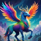 A vibrant, multicolored unicorn stands majestically on a shimmering golden surface amidst a lush, natural backdrop with waterfalls, exuding a magical and whimsical aura.