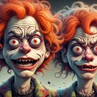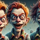 The image features three sinister clowns with exaggerated features, bright orange hair, pale skin, and wide grins. They wear colorful outfits, creating a strikingly eerie and playful atmosphere.