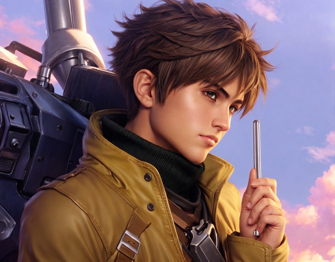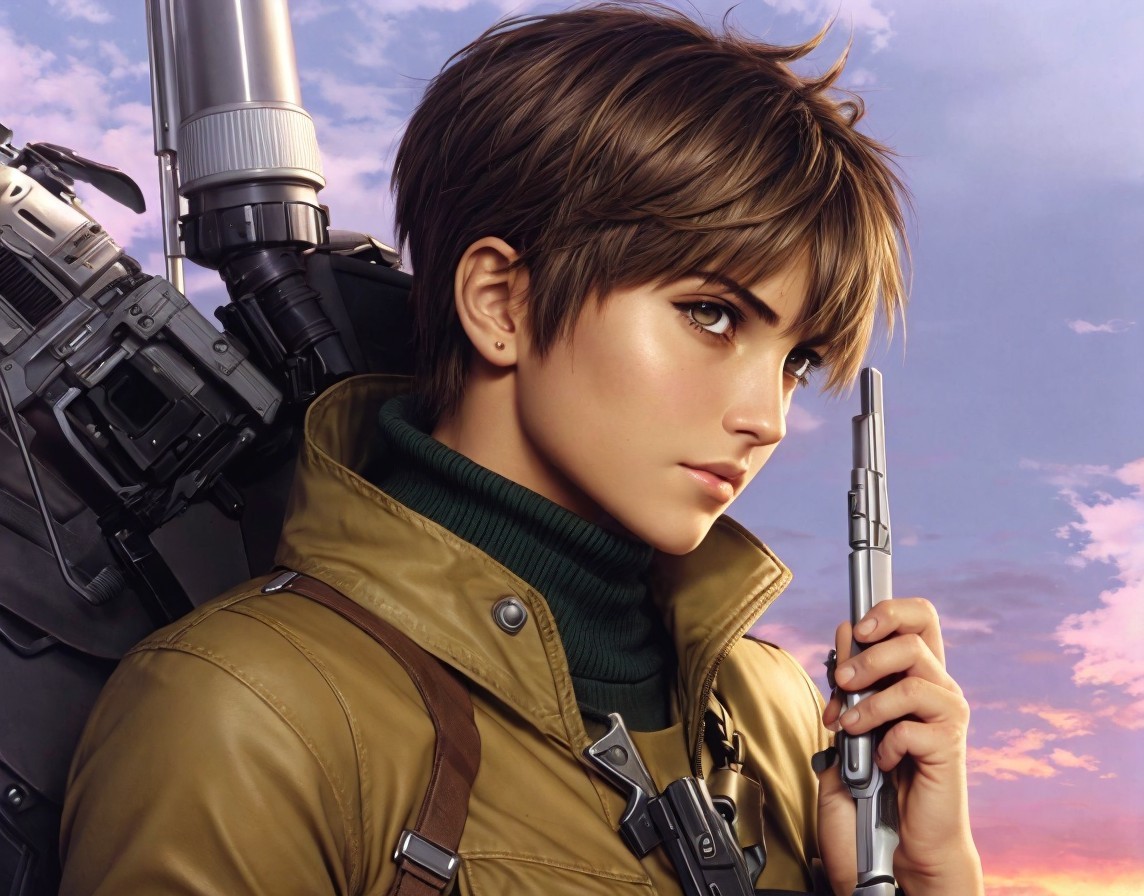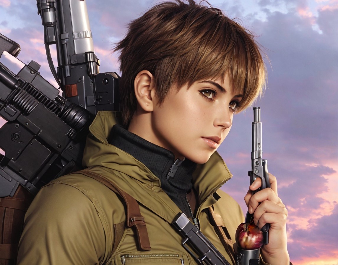 Short-haired person in tactical gear with headset holding radio and rifle against dusk sky.