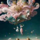 The image depicts a dreamlike scene with a celestial figure atop a cloud adorned with ornate details. Below, two ethereal figures hold hands amidst floating birds and whimsical elements, creating a surreal atmosphere.