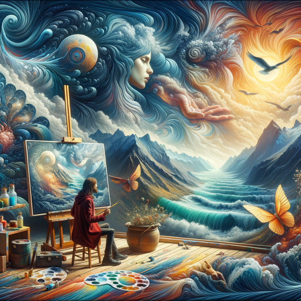 Two figures sit in a surreal room overlooking a cosmic landscape with planets and vibrant clouds. One reads while the other gazes thoughtfully, surrounded by a blend of nature and technology.