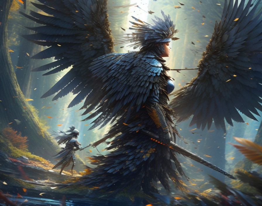 A warrior with expansive bird-like wings and feathered armor soars above a forest, wielding a spear, alongside smaller winged figures.