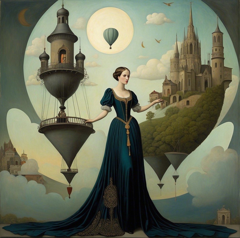 A woman in a flowing blue dress stands gracefully, surrounded by dreamlike landscapes featuring floating structures and whimsical architecture, under a moonlit sky filled with stars.