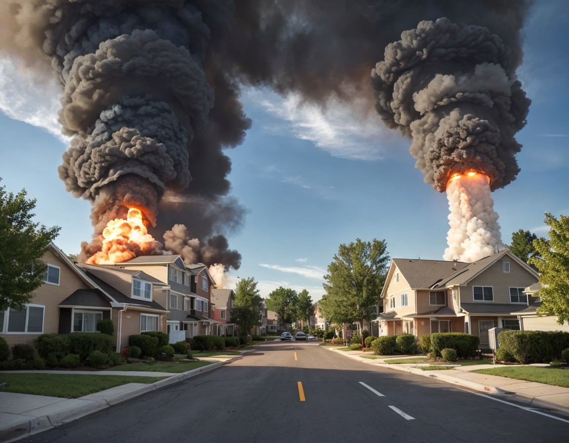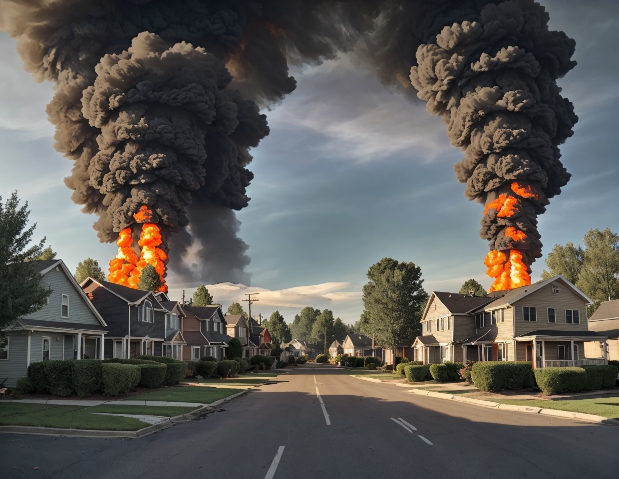 A group of people stands amidst a dystopian scene with multiple massive explosions and fires on a devastated street.