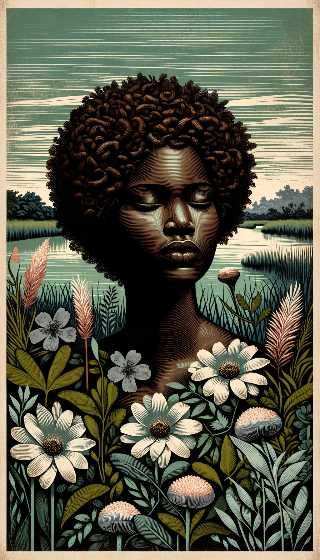 This young African american woman, becomes thec entral focus of a vintage botanical poster. Portrait sized. clouds and light only, A young black woman with no outlines around her face and body to separate her from the background pauses to appreciate night on the marsh., elimated sun in distance only clouds and light, off center design, blues and yellows, faded grey turquoise in the sky, more distinct lines in the linocut, faded colors, vintage, the everglades national park in Florida, sorrounded by marsh flowers including flat topped white astor, Water hemlock, rushes, ferns,, greater fringed gentian,, , more distinct lines in the lino cut, add pale grey turquoise to the sky, a scene viewed in the Everglades in August, Intricate linocut art of grasses and flowers and faded dried flower heads, light gray, pale light grey blue, soft grey pink, olive, rust and dark greens, kay sage, raw figuration,, trompe l'oeil compositions, rusticcore , .. surreal, beautiful https://s.mj.run/DIXmmVj0JH8