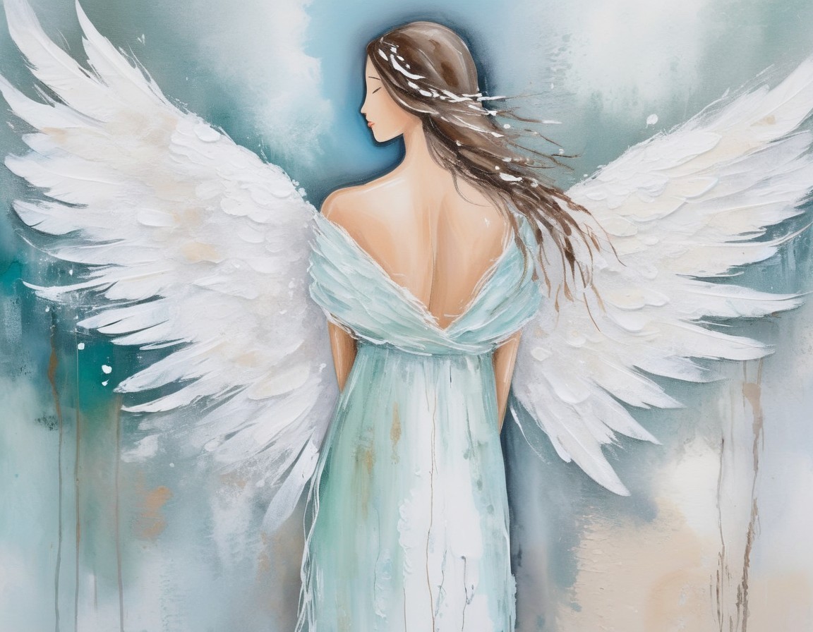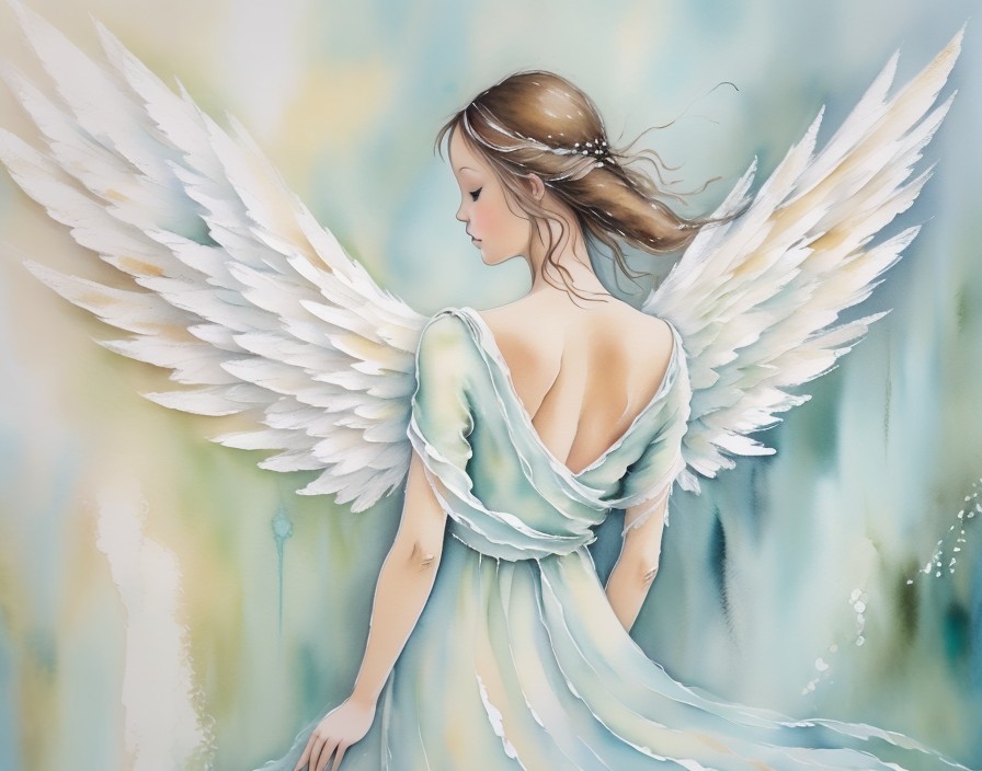 An ethereal angelic figure with expansive white wings, clad in a flowing dress, set against a soft, watercolor-like background.