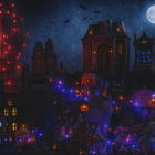 A haunted village bathed in moonlight, featuring eerie, twisted trees and houses adorned with glowing pumpkins. Lanterns illuminate the path, adding a mysterious, Halloween spirit to the scene.