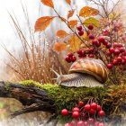 Brown Snail on Mossy Log with Red Berries and Leaves