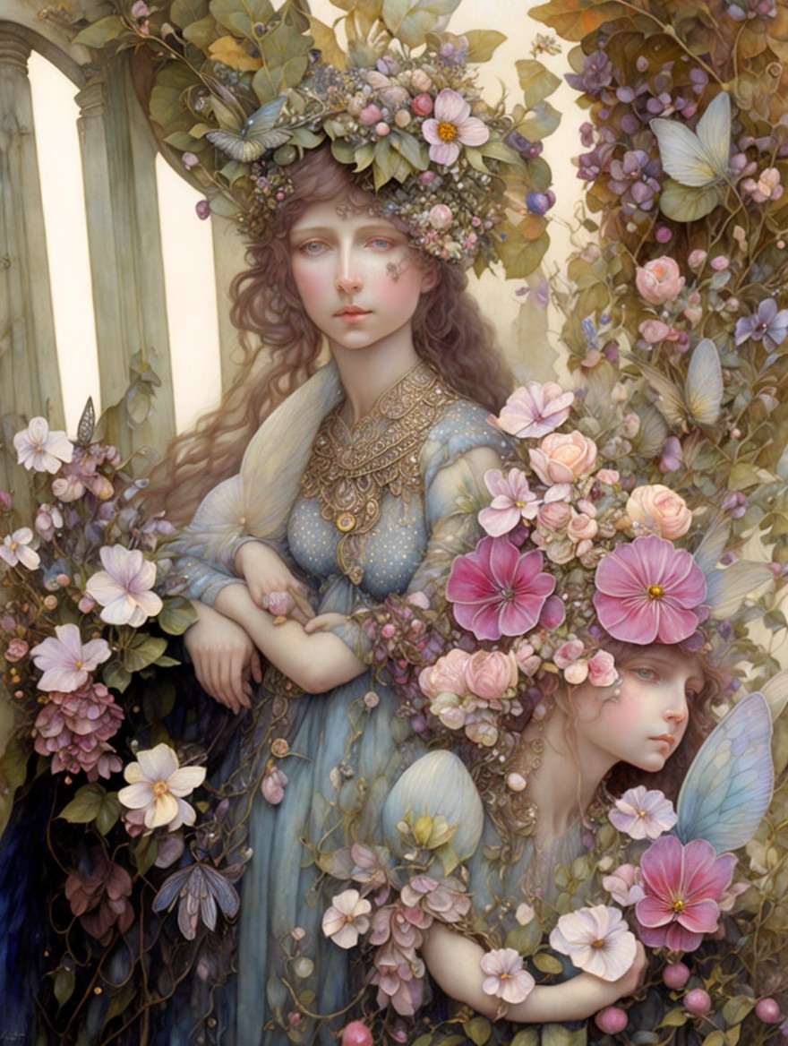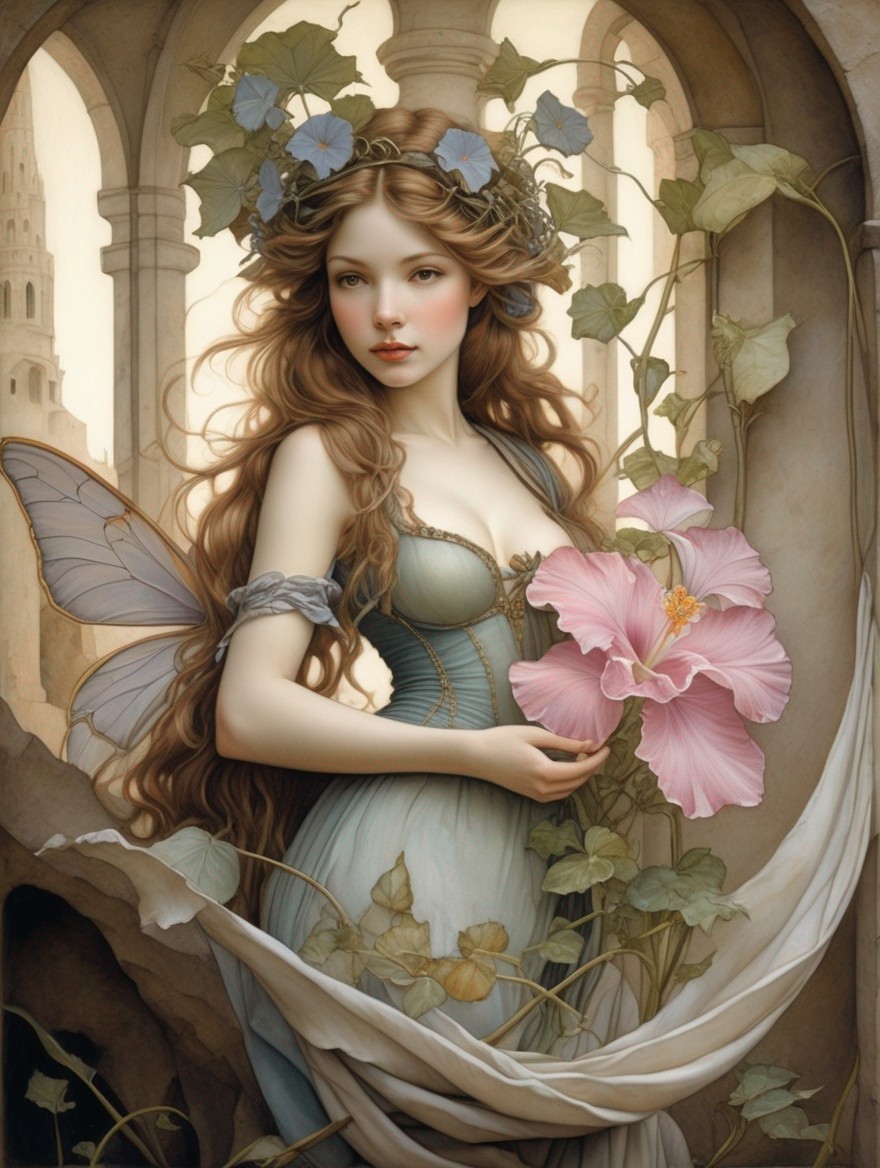 A serene painting of a woman with flowing auburn hair, adorned with blue flowers, in a classical draped gown, holding ivy, amidst stone arches.