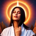A serene woman stands against a dramatic landscape, eyes closed and a blissful expression. An ethereal halo of light encircles her head, contrasting with the warm tones of the surrounding cliffs.