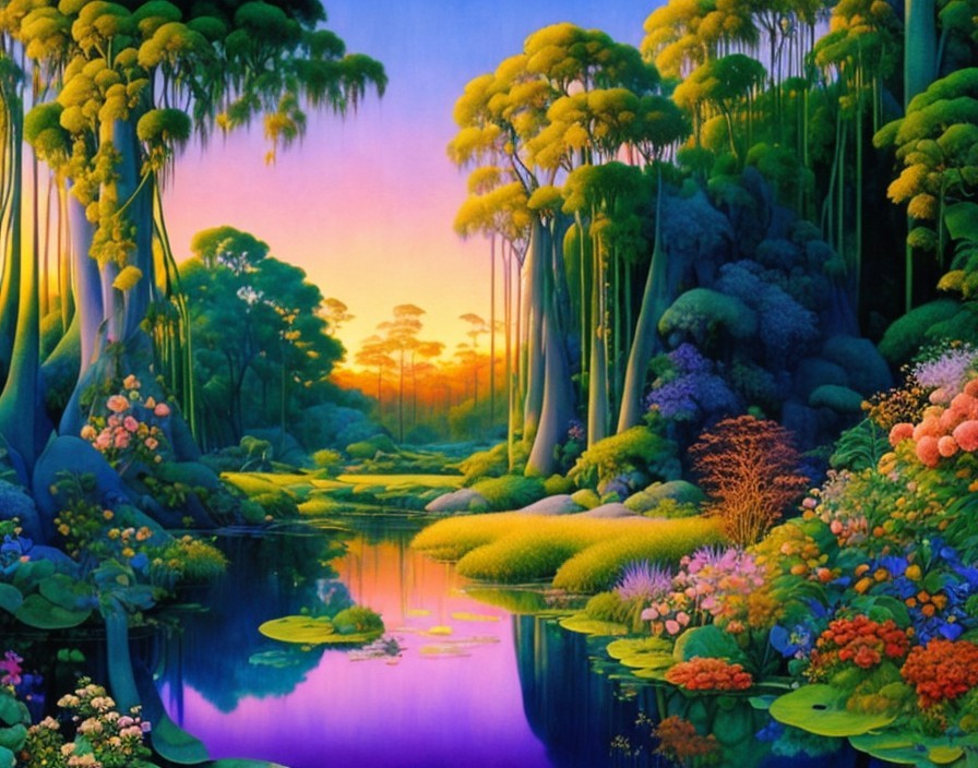 3D watercolor patchwork, Spectacular sunrise, high definition realistic jungle, stream, very slender trees along the banks, lacy teal colored plants, many brightly colored flowers, by Maxfield Parrish, with elements in the style of Jan Toorop