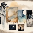 The artwork features a surreal composition with abstract figures, celestial elements, and muted colors. A striking, shadowy figure reaches out from a backdrop of geometric shapes and cosmic imagery.