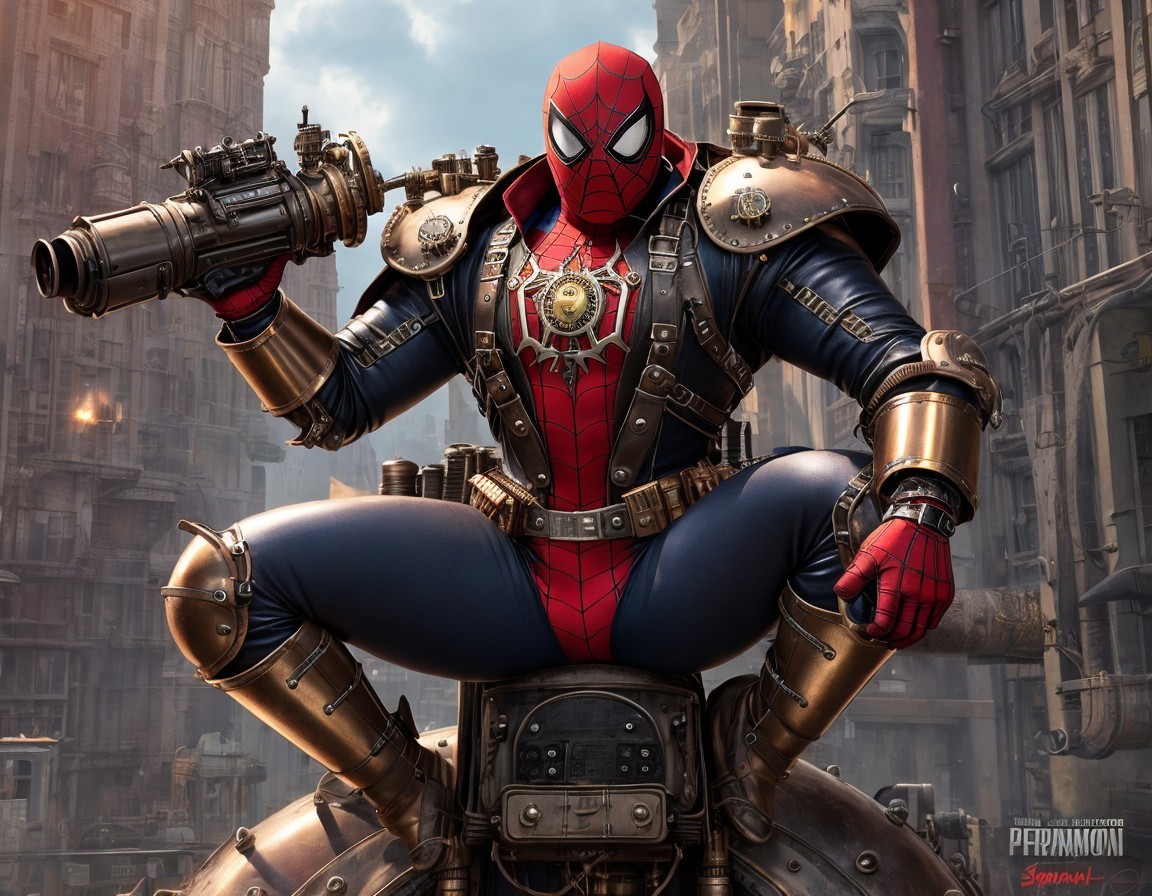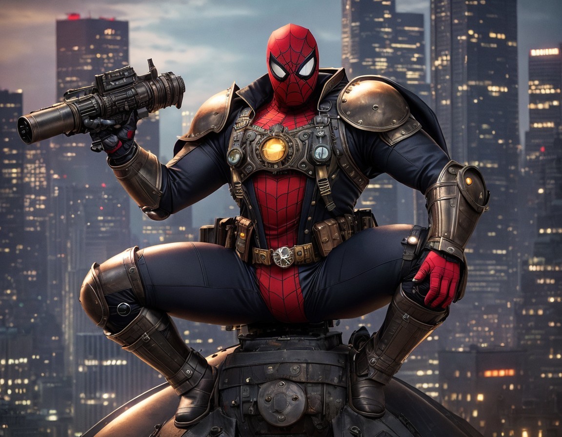 A stylized rendition of Spider-Man in an armored suit with a futuristic weapon, set against a cityscape at dusk.