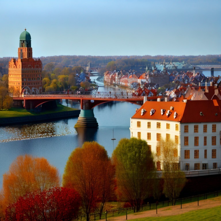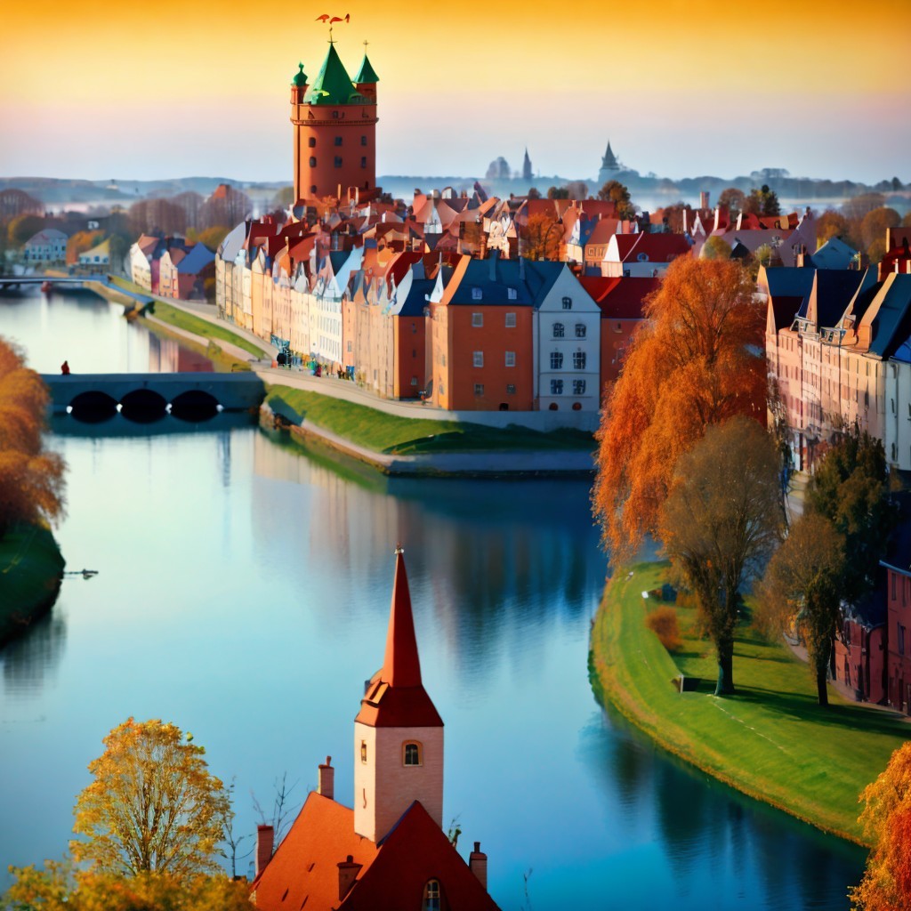 A vibrant artwork depicting a stylized castle on a riverbank with a sailboat in the foreground and a serene, colorful landscape.