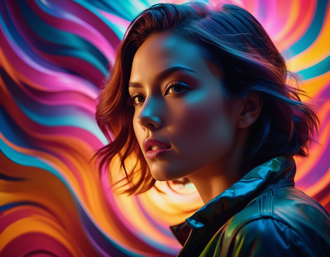A profile view of a woman with short, wavy hair, wearing a shiny jacket. She is set against a vibrant, swirling background of bright colors, creating a dynamic and energetic atmosphere.