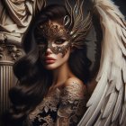 A glamorous figure wears an ornate masquerade mask adorned with feathers and intricate details. Her flowing hair and elegant attire evoke a sense of mystery and sophistication.