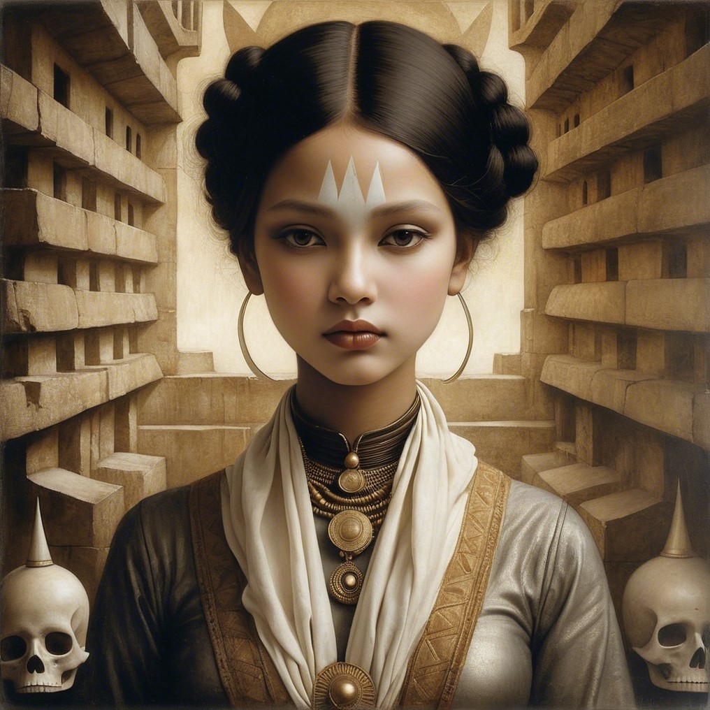 A striking portrait of a woman with intricate hairstyles and jewelry, set against a gilded background. She has a serene expression and a distinctive white mark on her forehead, flanked by skulls.