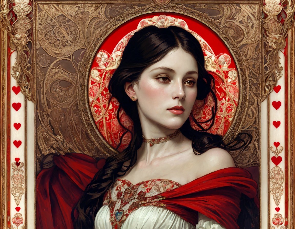 A woman with long, wavy hair, adorned with hearts, gazes serenely. She wears an elegant red and white gown, surrounded by intricate patterns and motifs, evoking a romantic and whimsical vibe.