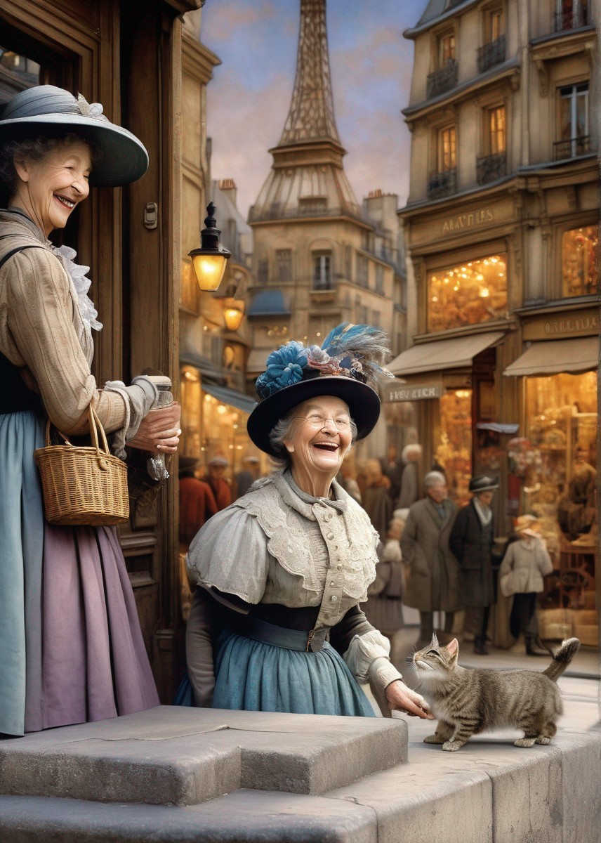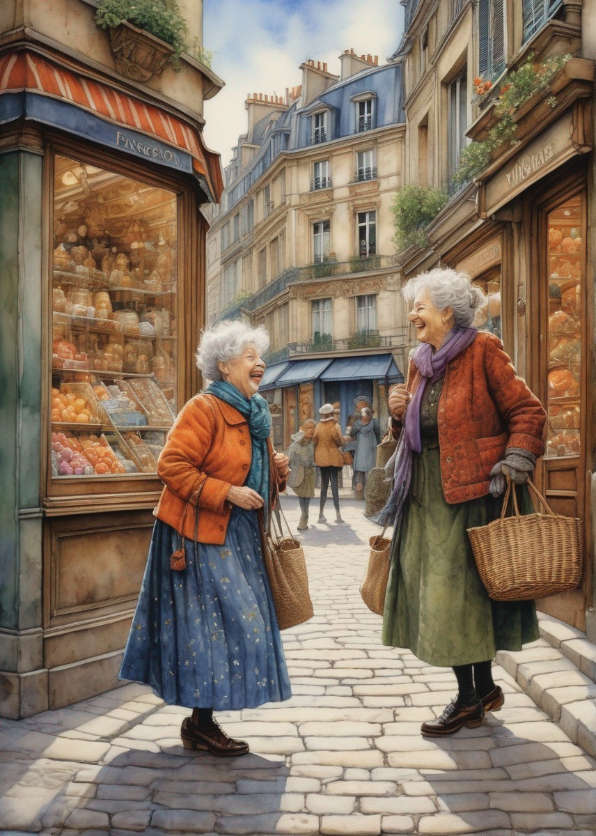 Two cheerful elderly women chat on a sunny street corner by a bakery, surrounded by quaint shops and a cobblestone road.
