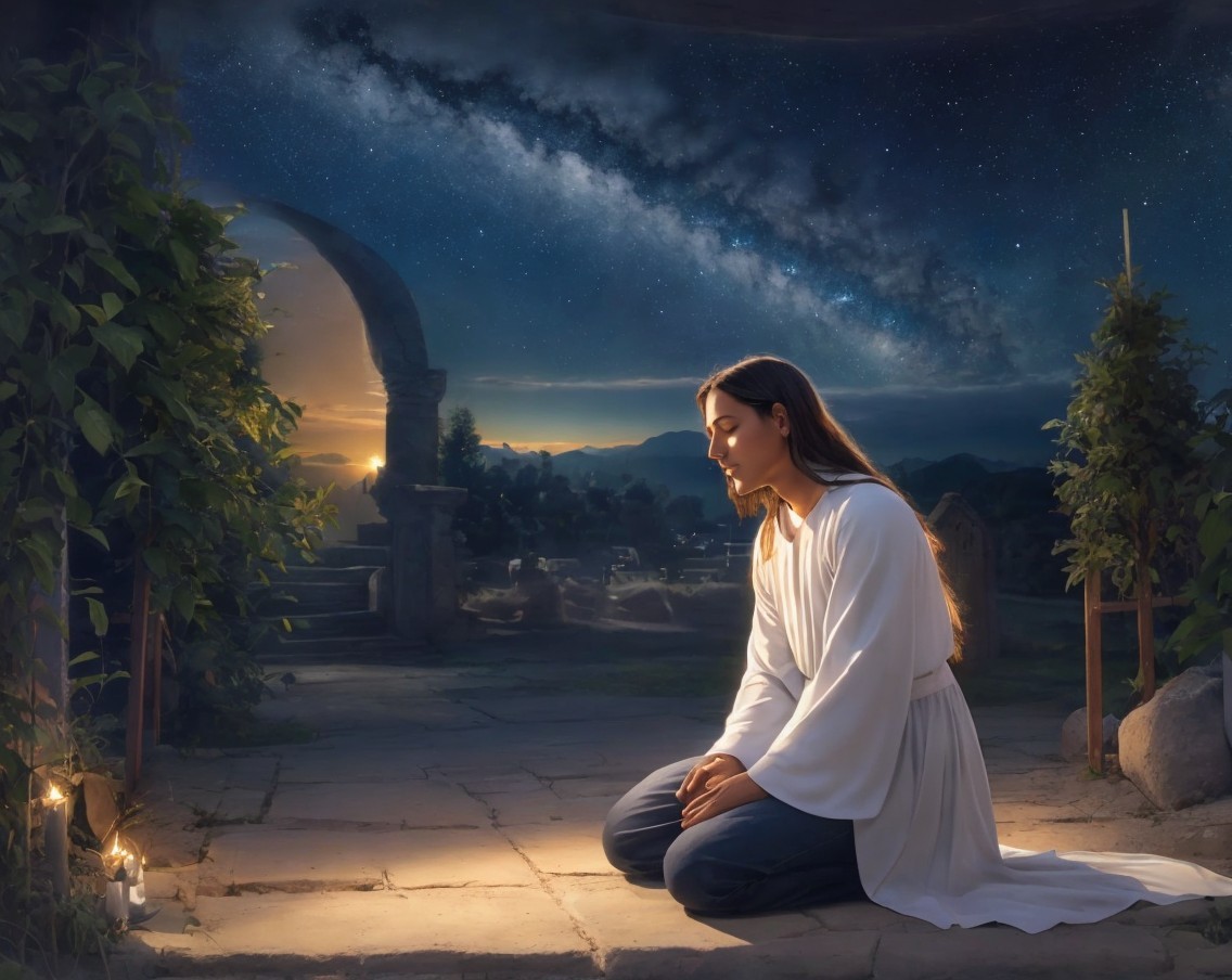 A woman in white kneels among candles under a starlit sky with a large moon.