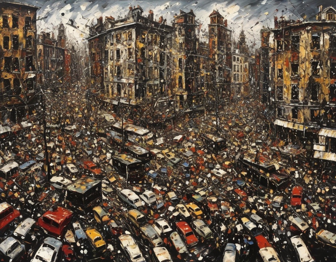 Vibrant, abstract cityscape painting with dense, colorful buildings and bustling streets filled with cars.
