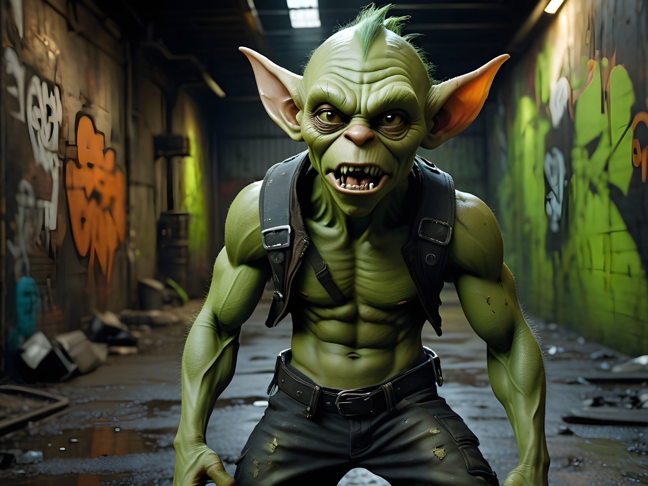 A muscular, green-skinned goblin with large ears and fierce facial features stands in an urban alley. The walls are covered in colorful graffiti, adding to the gritty atmosphere.