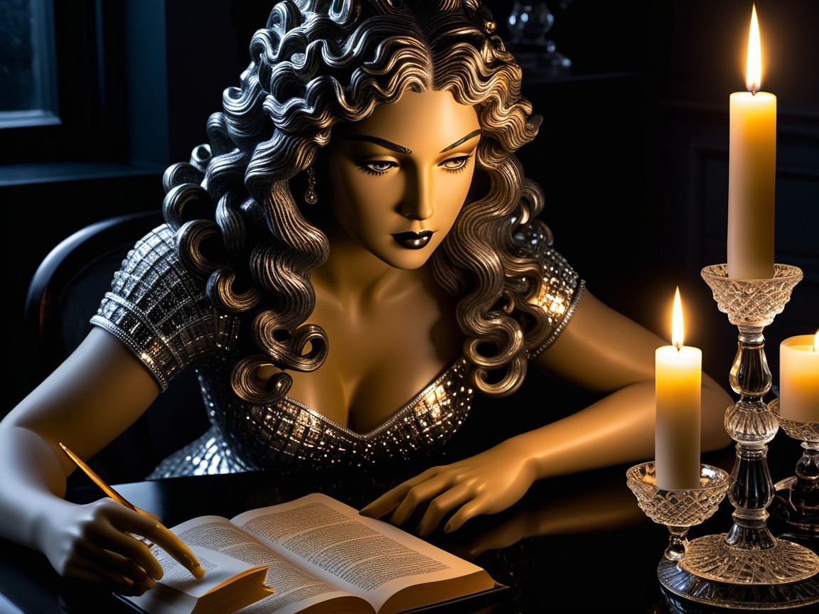 Prompt: "create a Waterford crystal Medusa reading a book at her desk by candle light in a darkened room. The viewer is directly across the desk from Medusa."