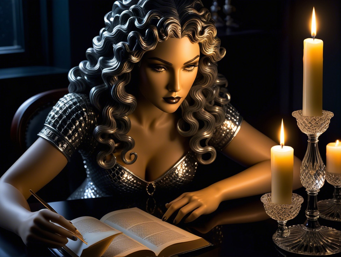 Prompt: create a Waterford crystal Medusa (with 5 fingers on each hand) reading a book at her desk by candle light in a darkened room. The viewer is directly across the desk from Medusa. Modify the locks of her hair to be glistening crystal serpents with ruby heads. The serpents are reading the book too.