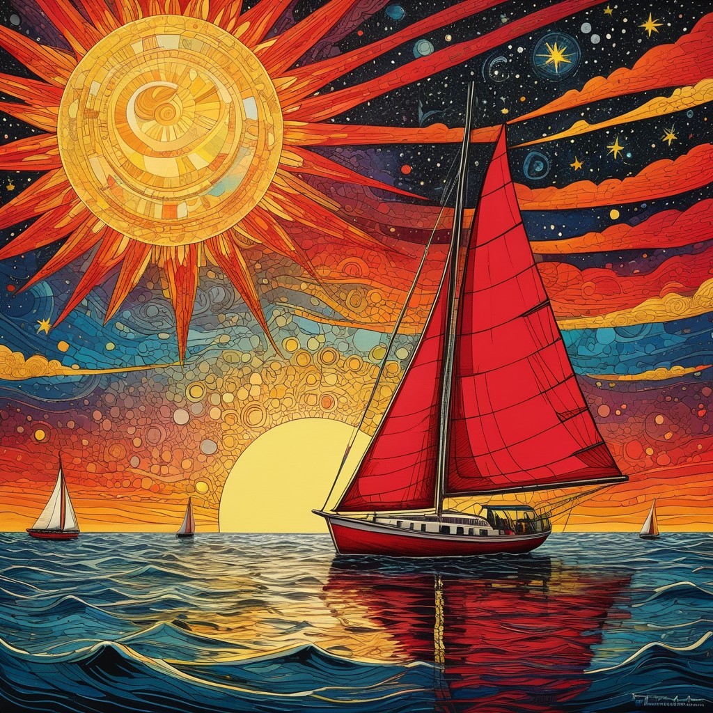 Prompt: (A masterpiece of unparalleled excellence), (("A vibrant artwork featuring a sailboat with a striking red and yellow sail against a radiant sun and starry background, reflecting a colorful sunset over calm waters". Side view, Complex stipple texture, Abstract expressionism surrealism, Pop art)), Inspired by the style illustrations of Edward Gorey, Tim Burton and Tomasz Setowski, Use stunning color oil drawing on textured paper, As if created By Paul Klee, Tim Burton, Tomasz Setowski, Kris Kuksi, Niki de saint phalle, Antoni Gaudí, Dee Nickerson and Jacek Yerka. (Full Size image)".