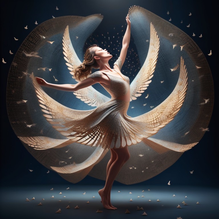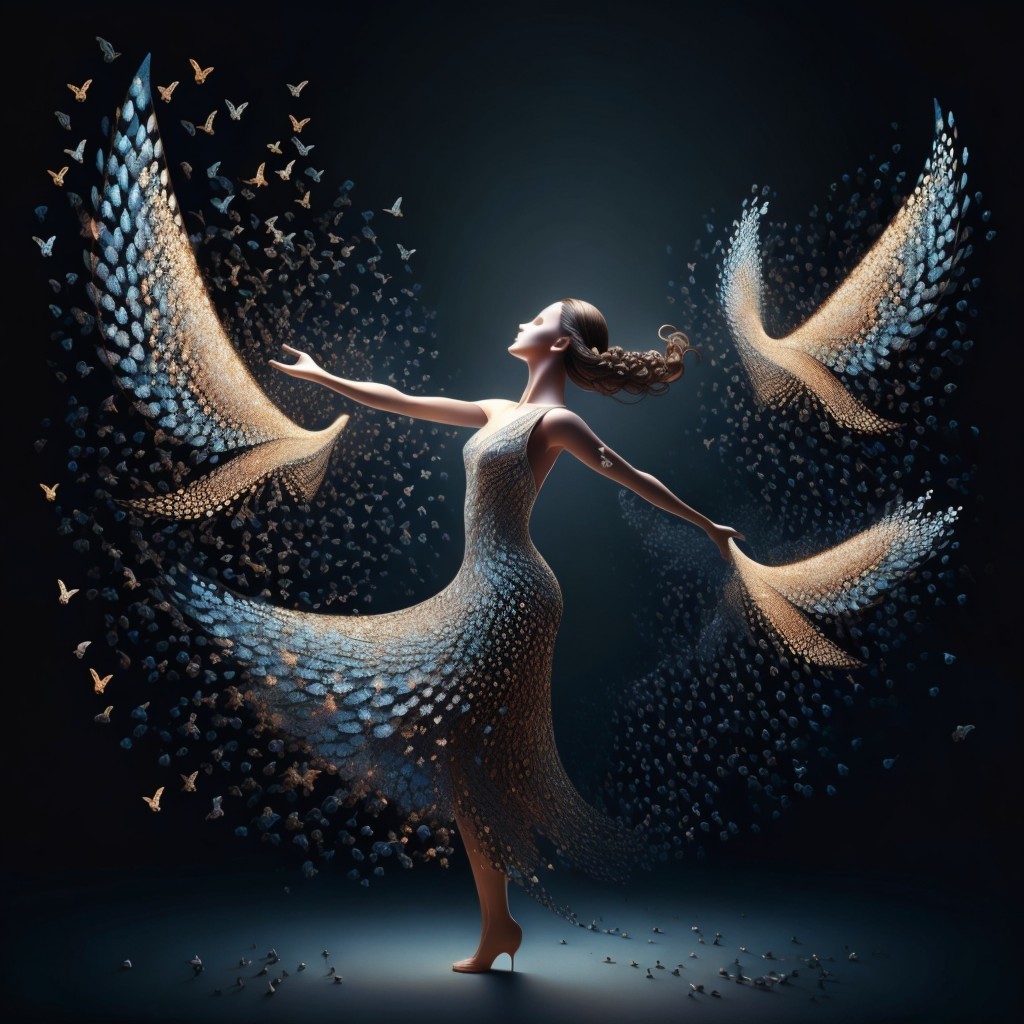 A graceful woman with flowing wings made of butterflies on a dark background, evoking a sense of freedom and whimsy.