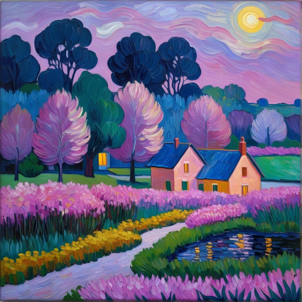 A vibrant landscape painting featuring a charming yellow cottage surrounded by colorful blooming flowers, with tall trees and a serene stream under a bright sunlit sky.