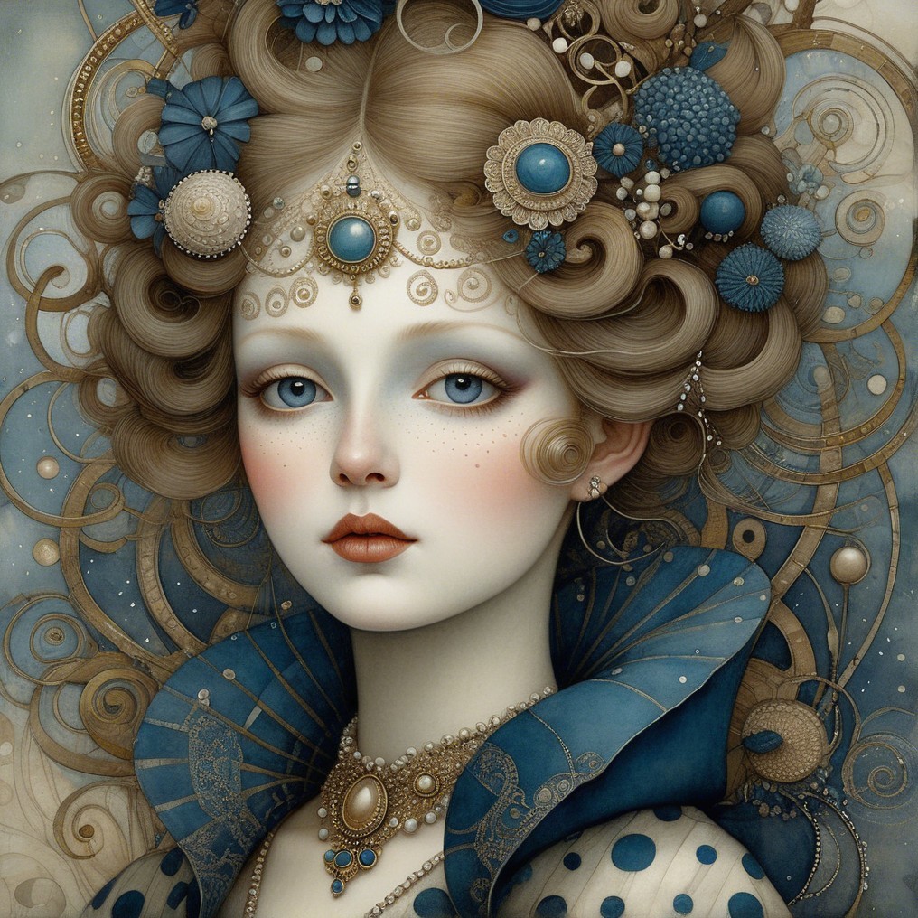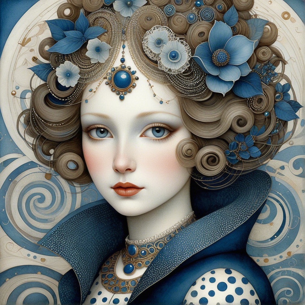 The image depicts a woman with intricate, wavy blue hair adorned with floral accents. She wears a stylish blue outfit with detailed patterns and striking makeup, exuding elegance and a dreamy aura.