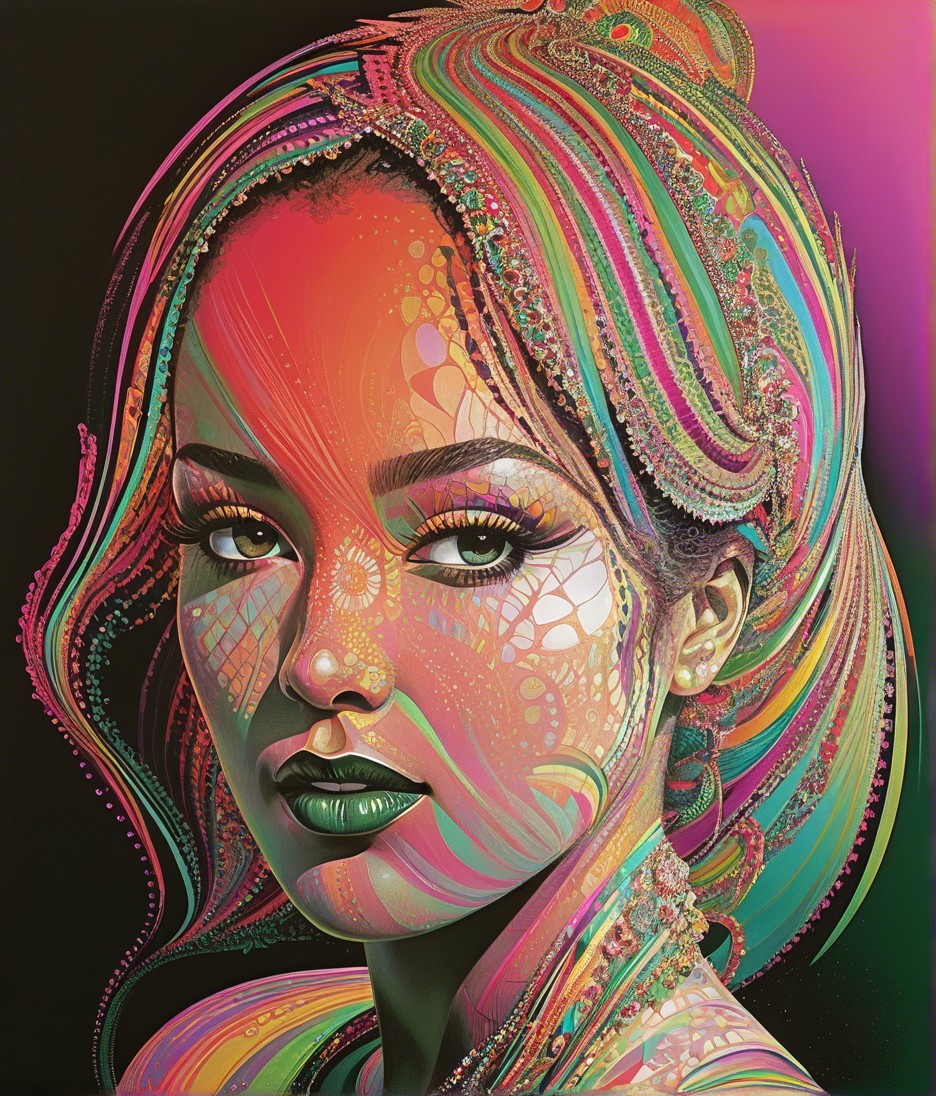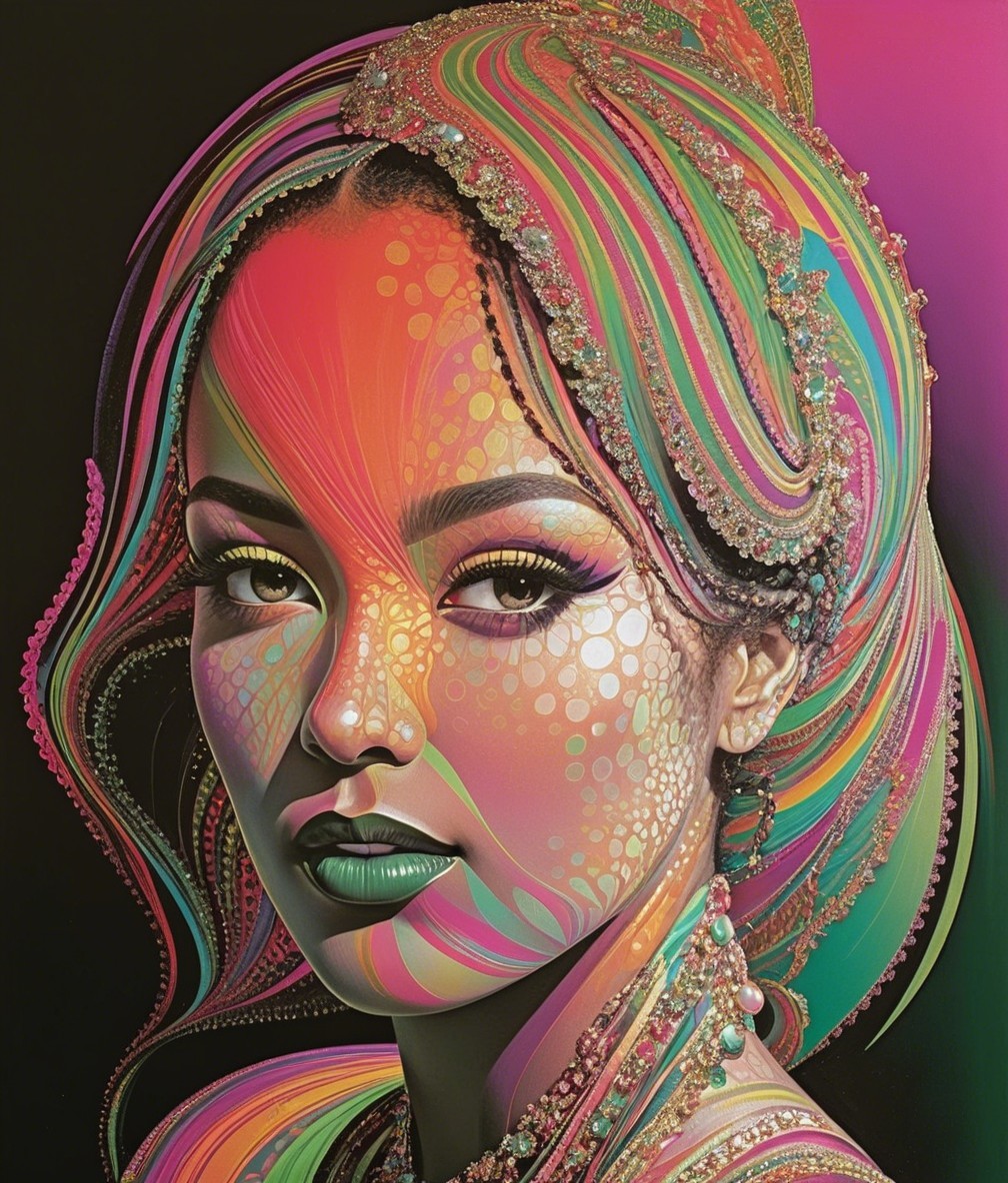 A vibrant, stylized portrait featuring a woman with intricate, colorful patterns in her hair and face, adorned with dazzling jewelry that enhances her striking features and bold makeup.