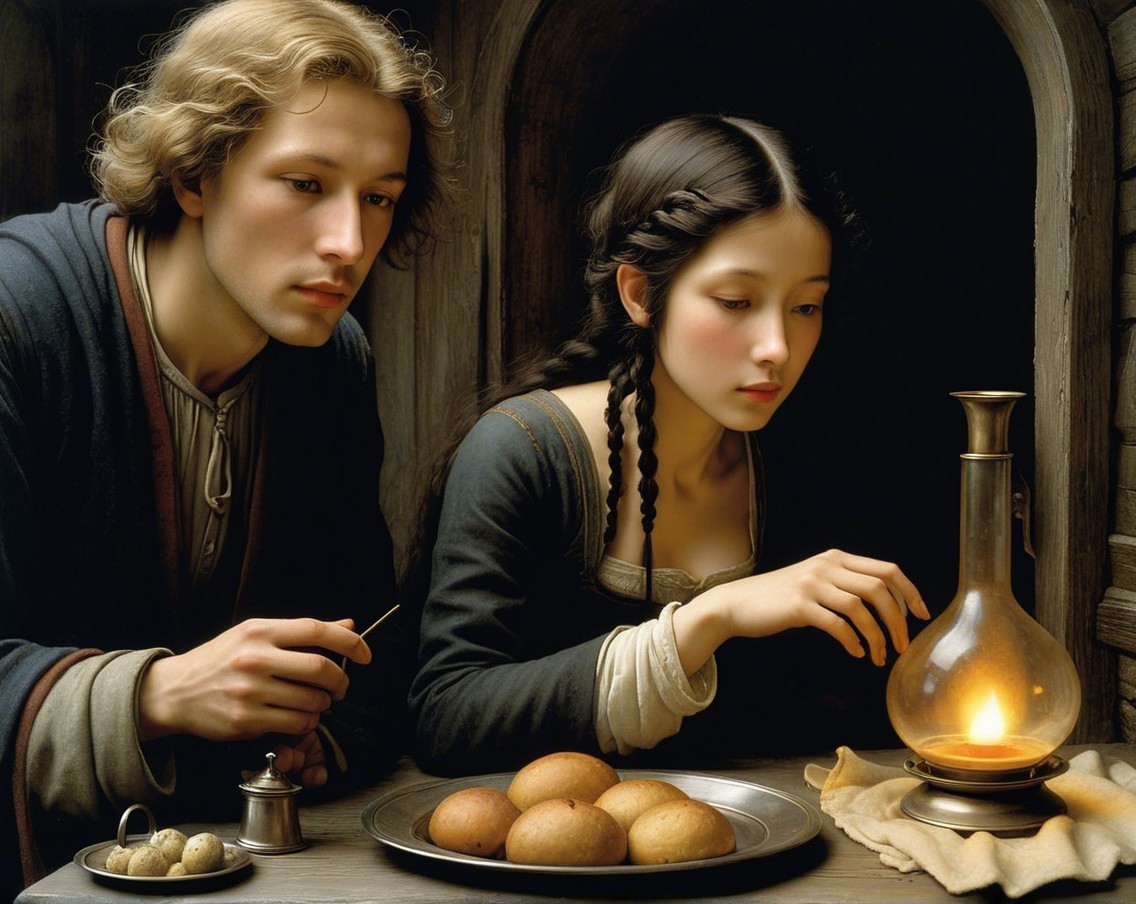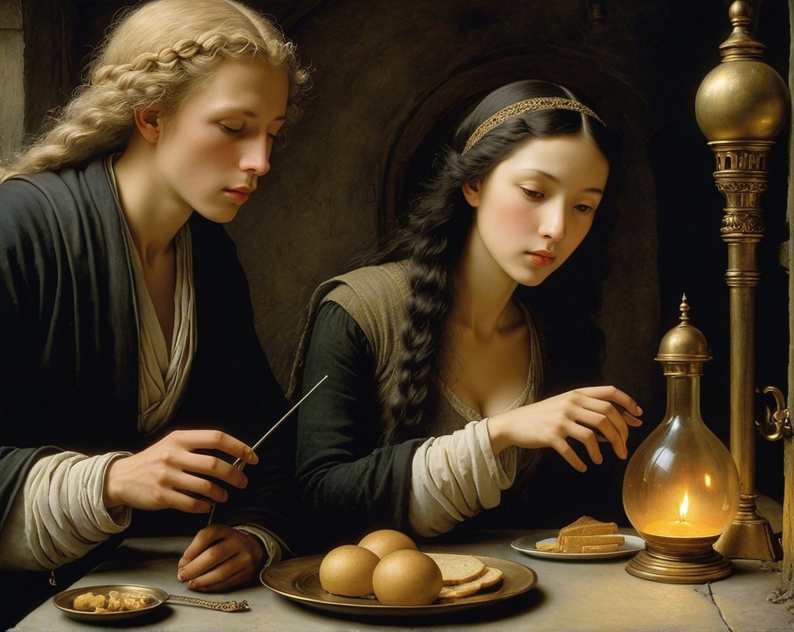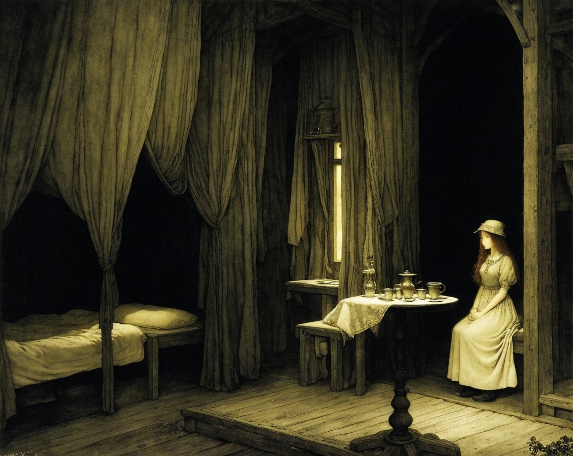 A serene scene depicts a woman in a flowing white gown, seated in a stone chamber with arched doorways. Stars twinkle above, creating a mystical atmosphere as she gazes into the distance.