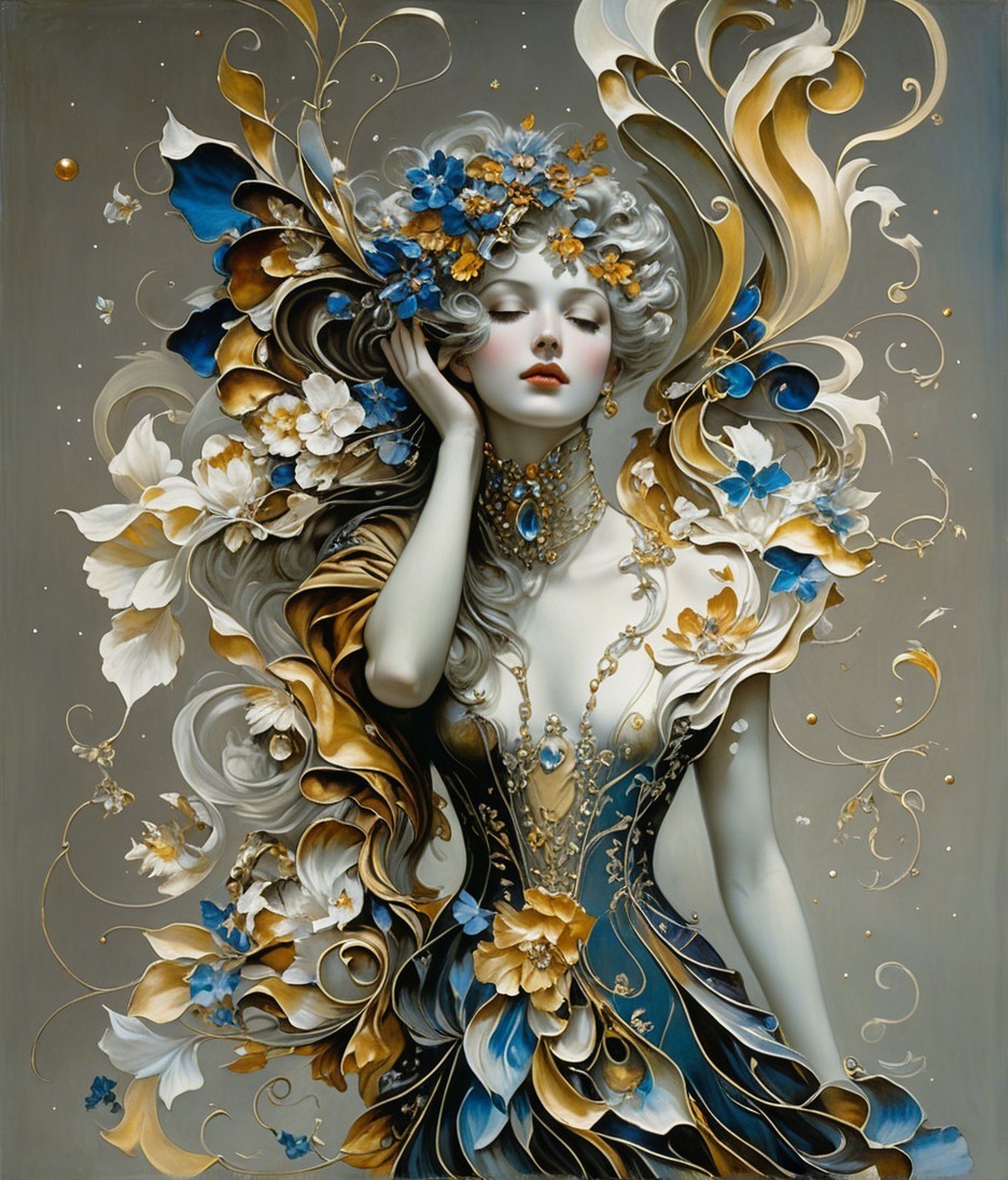 A graceful woman in an ornate dress surrounded by delicate flowers and swirling golden accents. Her flowing hair is adorned with blossoms, evoking elegance and beauty in soft, muted tones.
