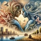 Two elegantly styled women face each other, their vibrant, flowing hair mimicking water dynamics. The serene background hints at a tranquil lake, enhancing the ethereal atmosphere.