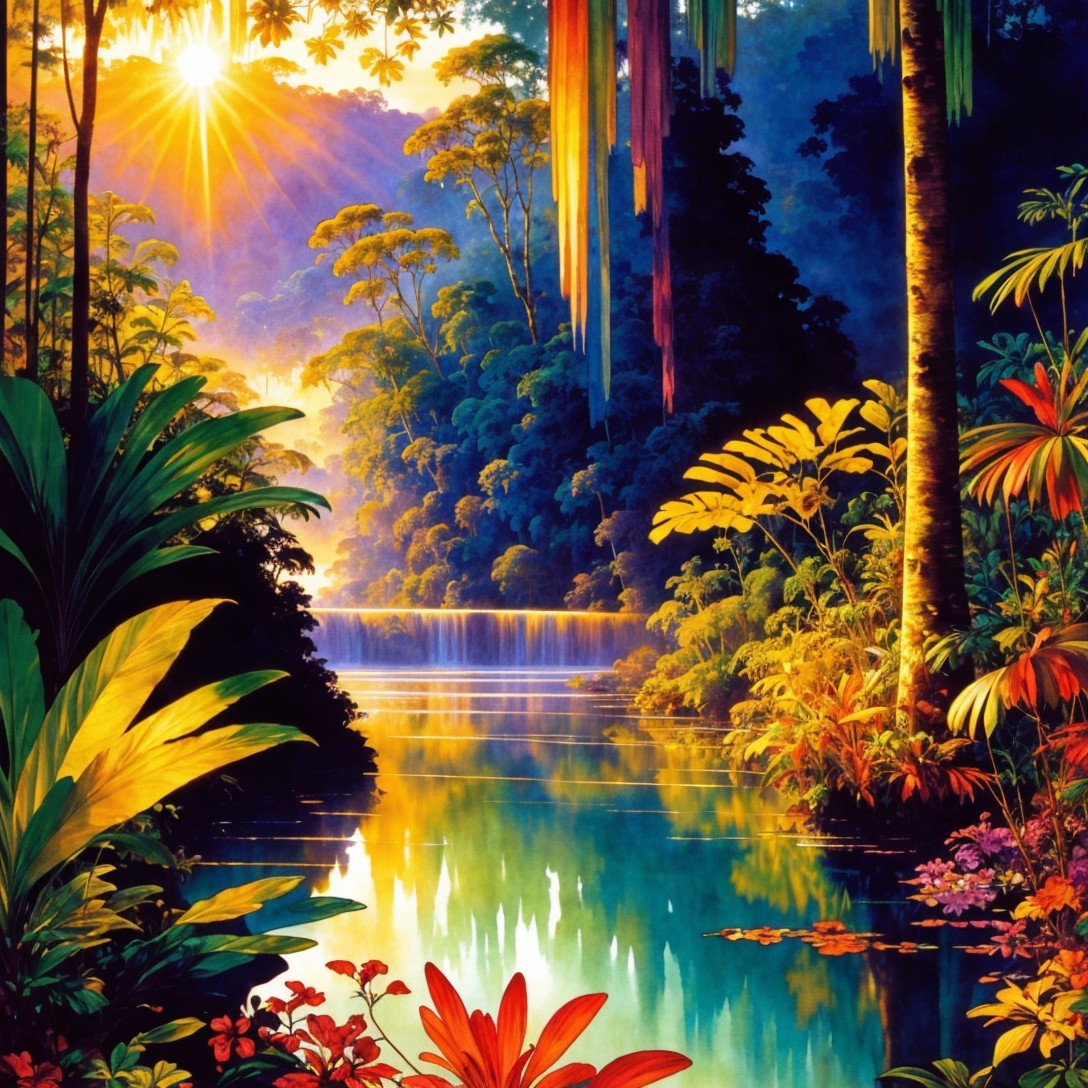 Full page, single image, 3D watercolor patchwork, fantastic wide view, spectacular sunrise over a beautiful Rainforest jungle river, satiny, high quality, shimmering, elegant, with vibrant saturated colors, elegant, highly detailed, glistening magic style, by Alphonse Mucha