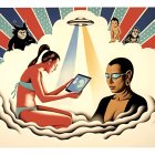 The image features a cloud with a woman in a bikini using a tablet, alongside a man in sunglasses and various figures like a Bigfoot and a spaceship above, creating a whimsical, surreal vibe.